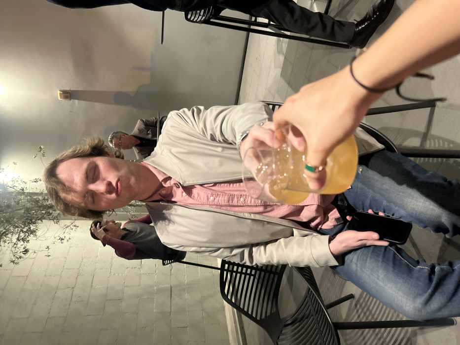 A person with blond hair wearing a light-colored jacket and pink shirt sits in a black metal chair. A hand pours a beverage into a clear glass in front of him. He holds a black phone in his other hand. In the background are other people, trees, and a white brick wall. Another person's legs and shoes are visible in the top of the image.