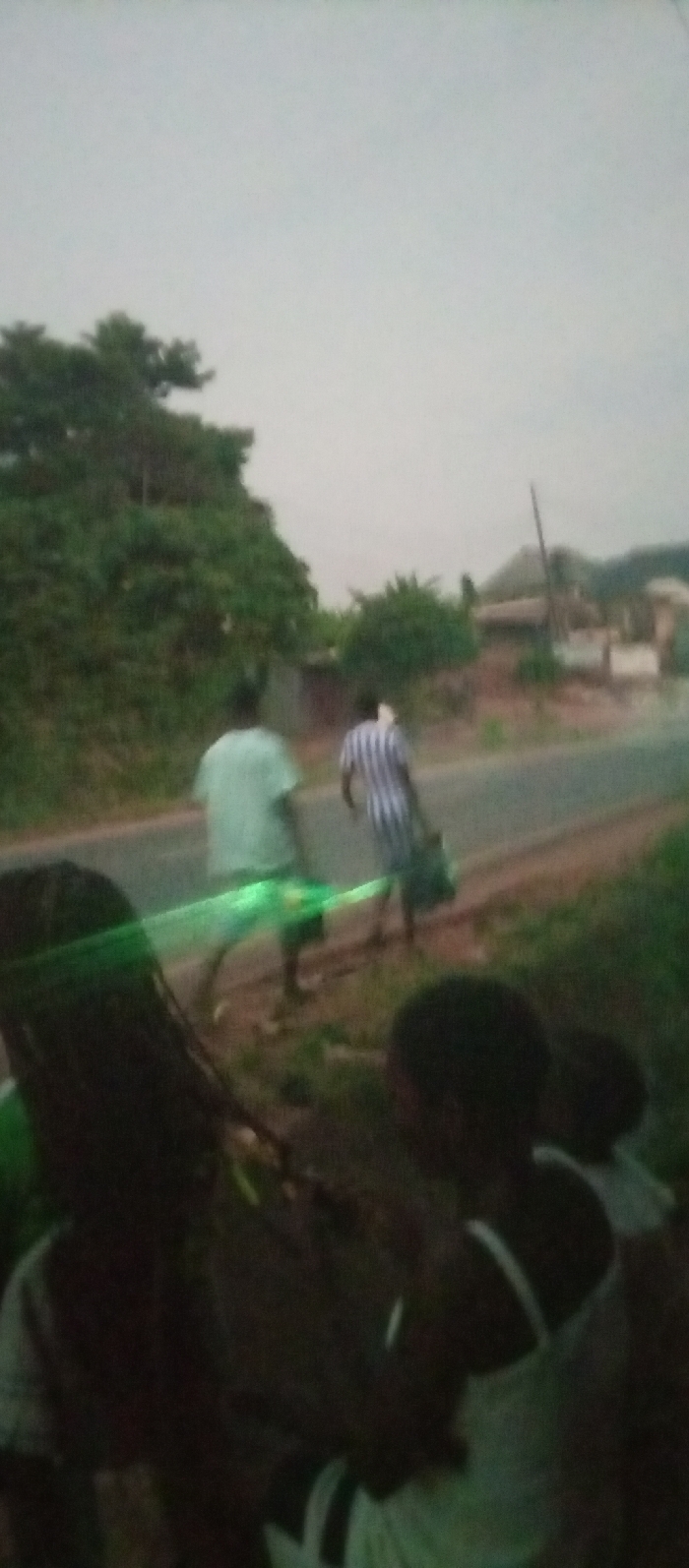 A blurry image displays a roadside scene. Two men walk on the asphalt, one in a light green shirt and the other in a striped shirt, carrying a bag. In the foreground, several figures, possibly children, are seated or standing, their forms obscured by shadow. A green laser light cuts across the scene. Trees and buildings are visible in the background against a cloudy sky, suggesting an outdoor, possibly rural, location.
