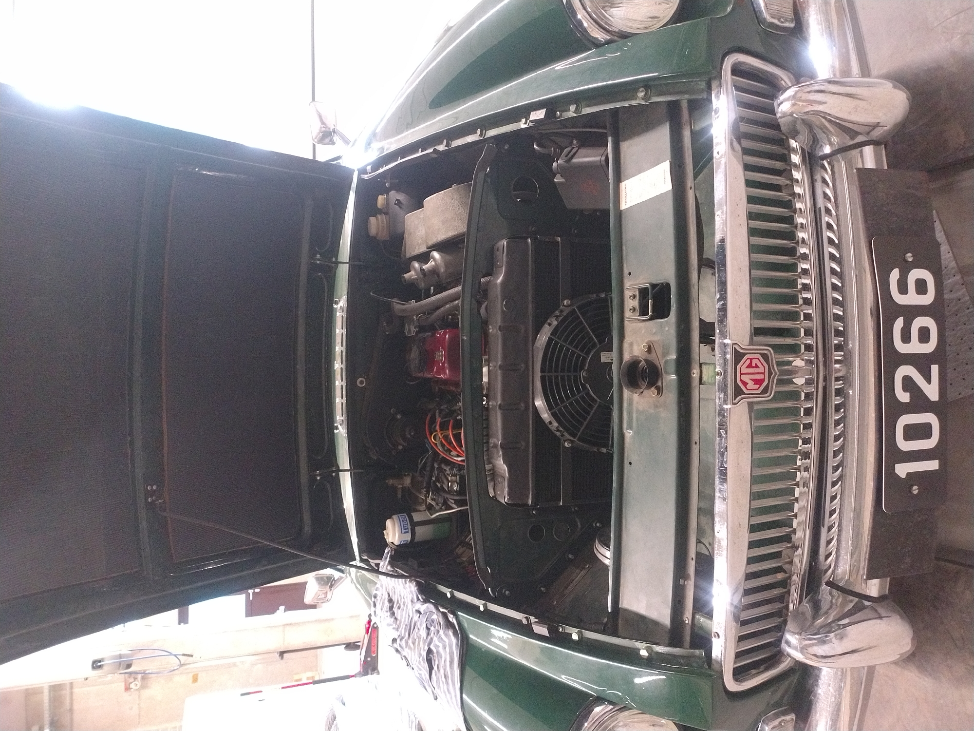 - "open engine compartment of a green classic MG automobile" by FM-M4lpO2, licensed under CC BY 4.0