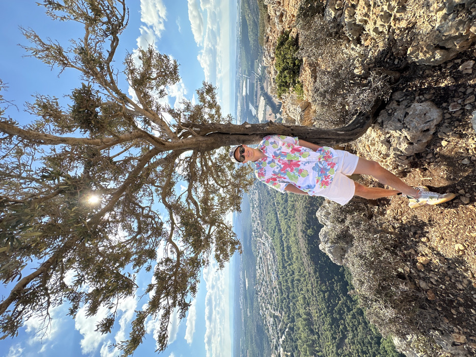 A full-body photograph depicts a male individual, approximately 20-30 years old, standing on a rocky outcrop in the Mate Asher Regional Council, Israel. He leans casually against the textured trunk of a gnarled olive tree, which occupies the right half of the frame. The man wears a white short-sleeved floral shirt with pink, green, blue, and yellow patterns, white shorts, light athletic shoes, dark sunglasses, and a white baseball cap. He looks forward towards the viewer with a slight smile. The immediate foreground comprises dry, rocky ground with sparse shrubs. Beyond, a panoramic view unfolds, starting with a dense green forest in the midground, interspersed with small settlements. Further in the background, agricultural fields and urban areas are visible, culminating in the Mediterranean Sea under a horizon of blue sky with scattered white clouds. Sunlight streams through the tree's foliage, creating a visible lens flare.