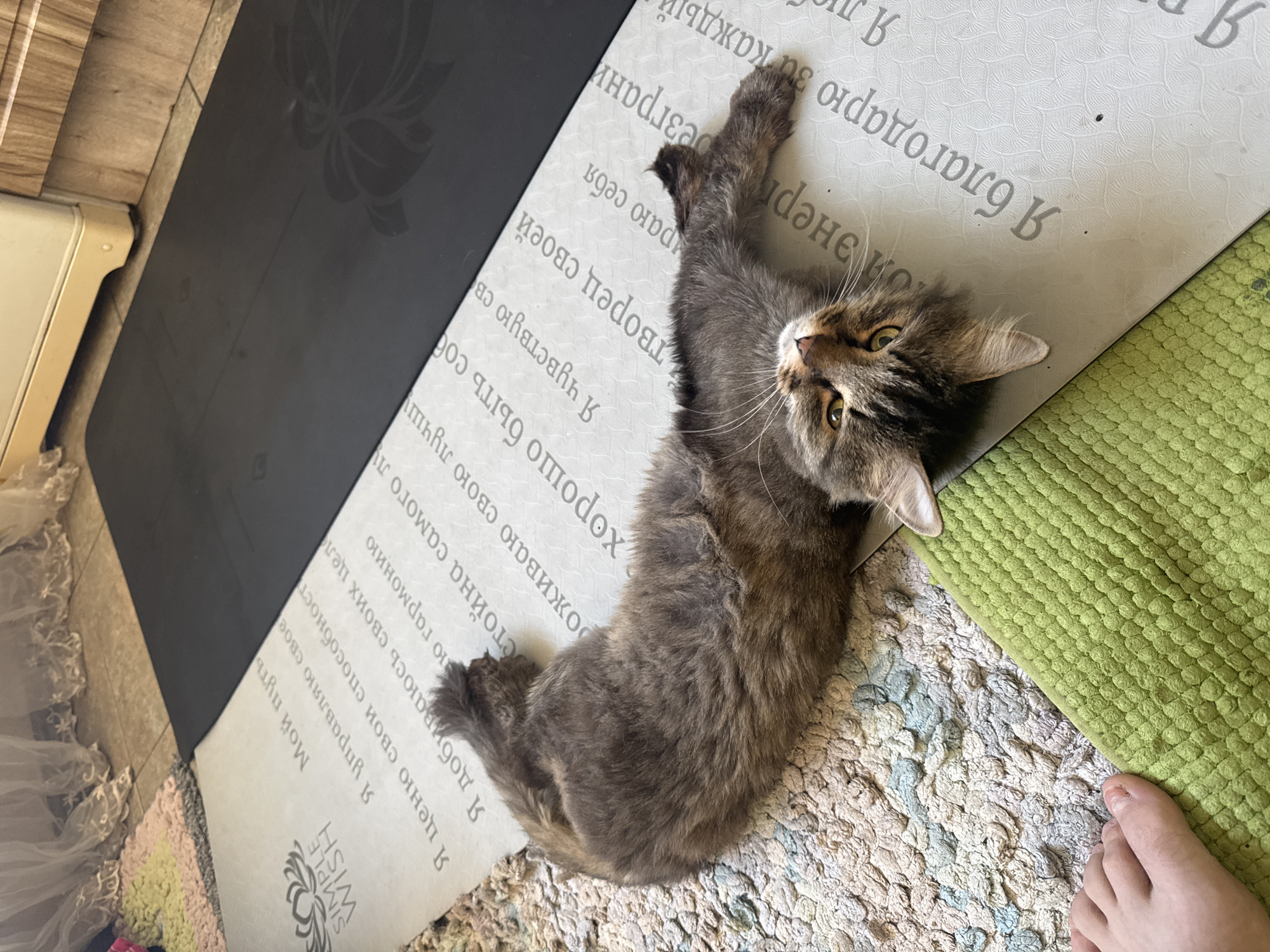 A fluffy, grey-brown tabby cat is lying on its back on a yoga mat with black, white, and green sections. The mat is placed on a rug with a multicolored pattern of blues, tans, and whites. A foot is visible in the bottom right corner of the image. The yoga mat is printed with text in the Russian language. The cat is lying on the portion of the mat with the printed text. A portion of the mat also has a decorative design, near the edge. The location of the scene is not discernible from this image.