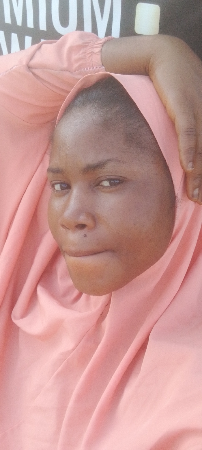 A close-up portrait, oriented vertically, depicts an adult female in Adankolo, Nigeria. She has dark skin and is wearing a light peach-colored hijab or head covering that drapes over her head and shoulders, extending downwards. Her face is centrally positioned and angled slightly towards the camera, with a direct gaze. Visible facial features include dark eyes, defined eyebrows, and a small dark mole located centrally above her upper lip. Her right hand, with fingers partially curled, rests on the fabric covering her head, near the top of the frame. The sleeves of her garment, matching the peach color, are visible, gathered at the wrist area. The background is dark, featuring partial white capital lettering, specifically "MIUM", in the upper left. A small, light-colored, cylindrical object is present in the upper right background.