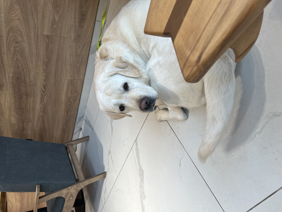 - "An indoor scene depicts a light-colored Labrador Retriever dog, equipped with a collar and a bright green leash extending behind it, lying on a white tiled floor" by FM-Vgo2F2, licensed under CC BY 4.0