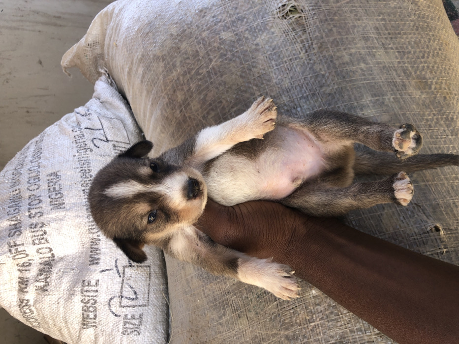 The image depicts an informal storage or market area in Bauchi, Nigeria. A young, brown and white puppy is held vertically by a dark-skinned hand. The puppy exhibits primarily brown-grey fur with distinct white markings on its face, chest, belly, and paws, and has a distended abdomen. Its eyes are partially open and dark. The hand securely supports the puppy's midsection, with fingers curled around its torso. Two large, off-white woven sacks are stacked in the background, filling most of the upper right frame. The upper left sack displays printed black text, including 'ADDRESS KM 16, OFF SHAGAMU M.', 'KAMALO BUS STOP OGIO. OGU', 'NIGERIA', and 'WEBSITE www.quadrantsteelsnigeria.co'. A light-colored, possibly concrete, wall or partition is visible behind the upper left sack. The scene is brightly lit.