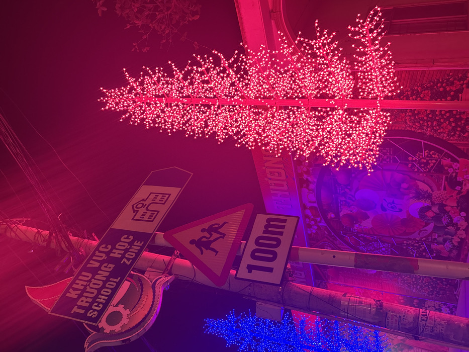 - "This nighttime scene is located in Quỳnh Lưu Commune, Vietnam, featuring a street illuminated predominantly by red and blue artificial light" by FM-j42G22, licensed under CC BY 4.0
