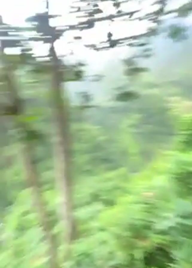 three men sitting at a long, wooden table on a covered patio, possibly in a restaurant. There are menus, condiments, and other items on the table. The patio overlooks a lush green valley with a multi-tiered waterfall cascading down the hillside. The vegetation surrounding the waterfall is dense and verdant.