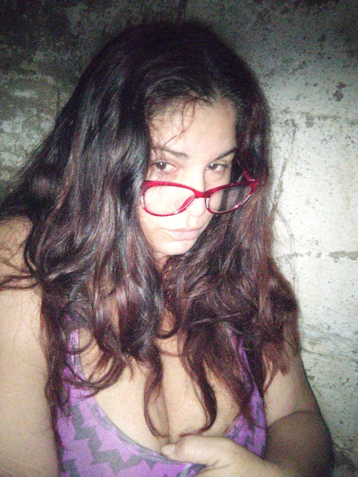 A single adult female is depicted in a close-up, chest-up portrait against a rough, light-colored concrete or masonry wall. She has long, dark, wavy hair, which falls over her shoulders and chest. She is wearing red-framed eyeglasses, resting low on her nose. Her eyes are directed towards the camera. She is dressed in a purple tank top featuring a light gray chevron or zigzag pattern, with a low neckline that reveals cleavage. Her left hand is visible, resting on her upper abdomen/lower chest, partially grasping the fabric of her top. The lighting is dim, resulting in a grainy image. The location is an unspecified indoor or enclosed space in Unknown, Unknown.