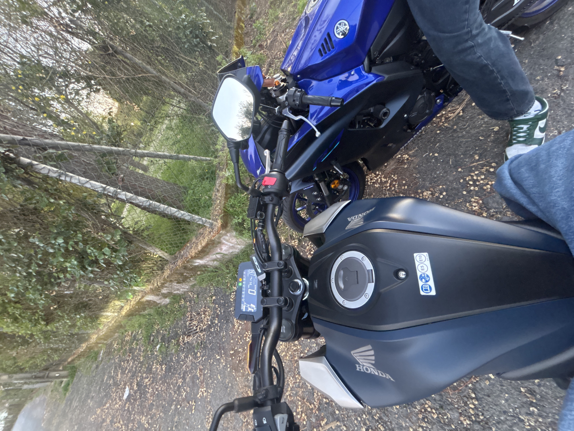 A high-angle, eye-level shot shows the handlebars and fuel tank of a blue Honda motorcycle, with the front end of a blue Yamaha motorcycle visible in the upper right corner