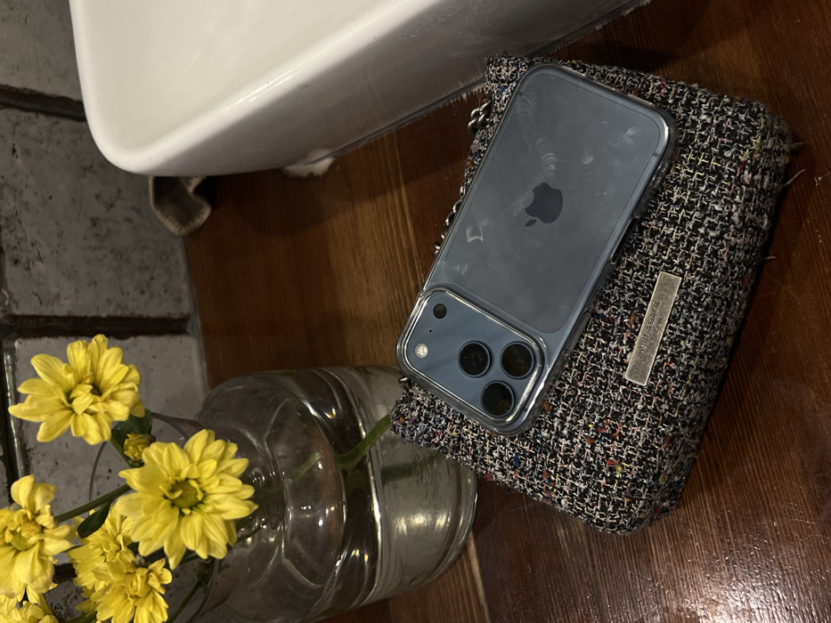 The image displays an interior scene, presumably a restroom, situated in Yerevan, Armenia. A dark, polished wooden counter serves as the primary surface. On the left, a clear glass vase, half-filled with water, contains a bouquet of approximately seven vibrant yellow chrysanthemum-like flowers with green stems. Centrally placed on the wooden counter, overlapping the vase, is a small Kurt Geiger London handbag. It is constructed from a textured, dark tweed fabric with multicolored flecks, featuring a visible metallic chain strap. A silver rectangular plaque inscribed "KURT GEIGER LONDON" is affixed to the handbag's front. Resting horizontally on the handbag is a dark-colored iPhone, likely a Pro model due to its triple-lens camera system, enclosed within a transparent protective case. The Apple logo is discernible on the phone's back. To the right, a portion of a white ceramic rectangular sink is visible, its edge curving towards the foreground. The background features a dark, roughly textured wall, possibly brick, and a small, folded brown towel partially visible behind the sink. No individuals are present in the scene.