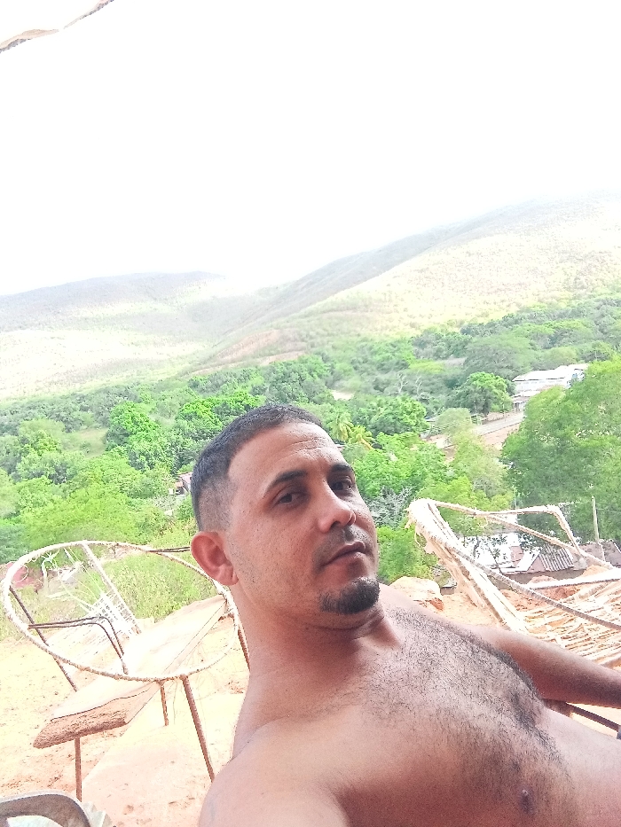 A shirtless man sits outdoors, likely in a chair, as suggested by the rusted and worn metal frames beside him. He has short, dark hair and a goatee. A green valley stretches behind him, leading to a hillside partially obscured by fog. A few buildings are visible among the trees. The overall image suggests a casual, relaxed setting with a scenic backdrop.