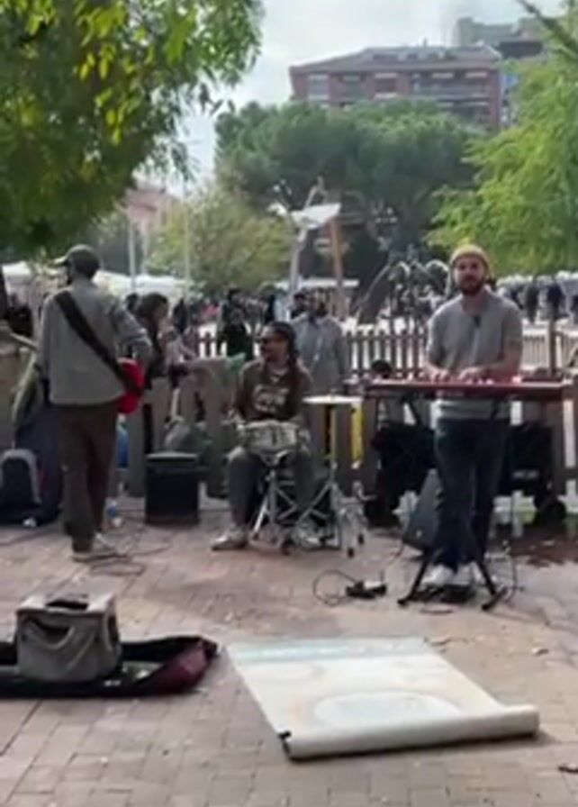 The scene captures a live performance of a musical band set up in what seems to be a city square or park
