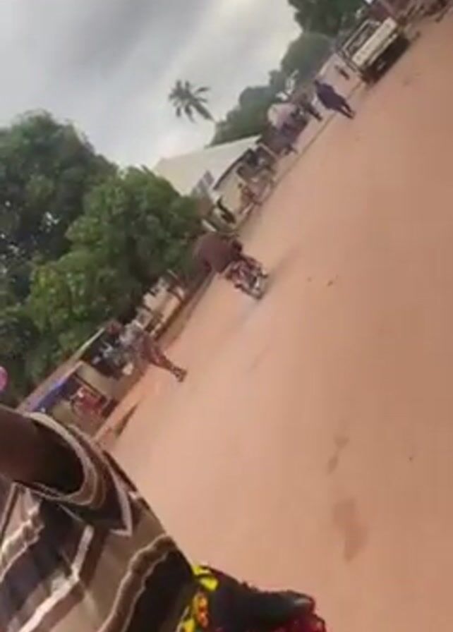 The video depicts a dusty, unpaved road in what appears to be a village or rural area