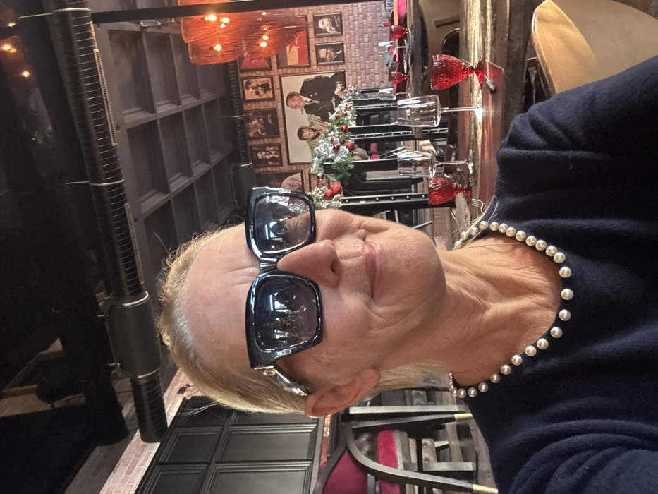 - "A mature woman with blonde hair, wearing large, dark, square-framed sunglasses with reflective lenses and a pearl necklace over a dark blue long-sleeved top, is shown taking a selfie" by FM-CAOHw1, licensed under CC BY 4.0