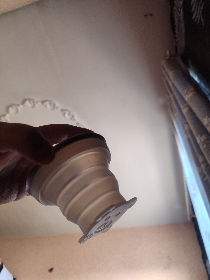 A human hand with dark skin holds a light-colored, ribbed collapsible silicone cup in a domestic interior in Andijan City, Uzbekistan. The cup is grasped near its upper rim, displaying its accordion-like structure and a circular base with multiple small holes. The background consists of a white ceiling featuring a decorative, undulating molding along one edge. Two small, dark, circular marks are visible on the upper right portion of the ceiling. To the right, a blue curtain with a darker patterned design is drawn, partially obscuring a window or wall. A light peach-colored wall is visible in the lower left section of the frame.