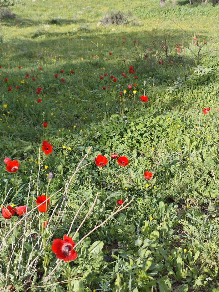 A vibrant meadow filled with red anemones and yellow wildflowers under dappled sunlight. Lush green grass and varied foliage cover the ground, creating a dense, natural tapestry. Several prominent red anemones are in the foreground, contrasting with the background of smaller red and yellow blooms scattered across the field. A few bare, slender branches weave through the flowers, adding texture to the scene.