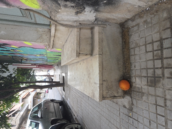The image displays an urban street scene in Athens, Greece, viewed from a low perspective on a sidewalk. In the immediate foreground, a single orange fruit rests on a gray concrete sidewalk composed of square tiles, positioned at the base of a two-step concrete staircase. The staircase ascends to a building entrance, where a light blue door frame is partially visible. The building wall alongside the steps is adorned with graffiti in vivid teal, pink, yellow, and black, with evidence of paint peeling on the lower portion. A corrugated gray cable descends vertically along the wall near the steps. To the left of the staircase, two slender tree trunks with green foliage emerge from cutouts in the sidewalk. Beyond the trees, an asphalt street is visible, populated by parked vehicles; a silver hatchback is prominently situated on the left side of the street. Further down the street, additional cars and multi-story buildings featuring balconies are discernible. No individuals are present in the scene.