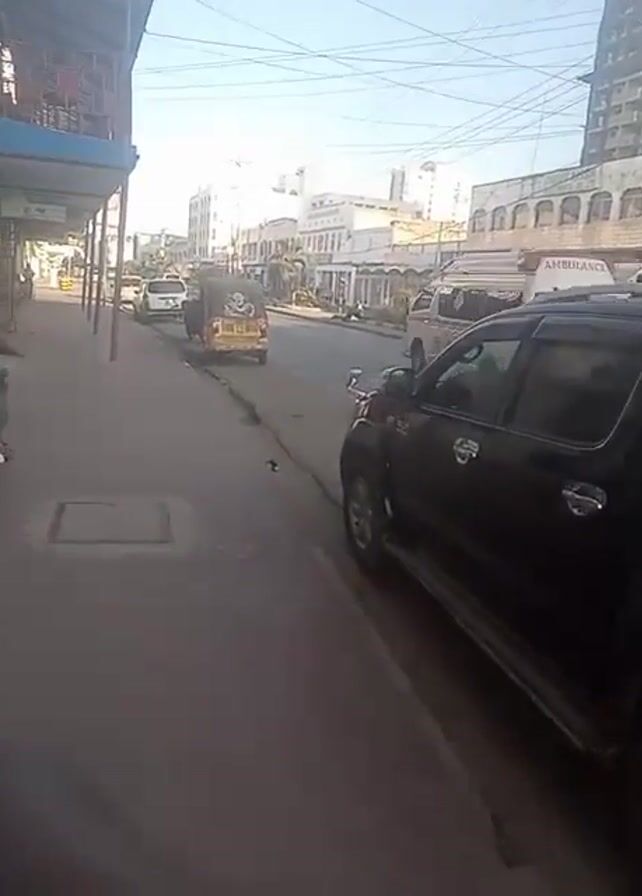 The video depicts a street scene captured from a stationary position along a sidewalk. A black pickup truck is parked on the right side of the frame, while across the street, various cars, a three-wheeled vehicle, and a motorcycle move in the same direction. Buildings line the street, and the sky is bright and clear. A man is seen riding the motorcycle on the left of the screen. The sidewalk where the camera is positioned is cracked and uneven. The video pans slightly to the left, capturing more of the street and the passing vehicles. The overall setting suggests a street in a moderately busy urban area.