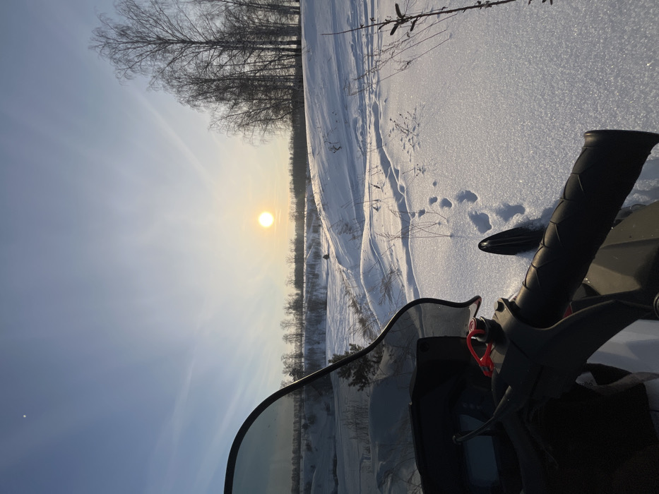 The image displays a panoramic winter landscape in the city of Новочувашский, Russia, under clear skies with a low sun. The foreground features the dark windshield and black handlebars of a snowmobile, positioned on a snow-covered rise. To the right of the snowmobile, animal tracks are visible in the fresh, untouched snow, alongside sparse, dry vegetation stalks. The midground reveals a snow-covered valley with rolling hills, traversed by a winding path, likely from another snowmobile. A small evergreen tree is visible in the valley to the left. The background consists of a distant line of deciduous trees without foliage, indicating winter conditions, extending across the horizon. The bright, circular sun is prominent in the sky, slightly right of center, casting long shadows. A faint crescent moon is visible in the upper left quadrant of the light blue sky, which shows minimal cloud cover. No individuals are visible in the scene.