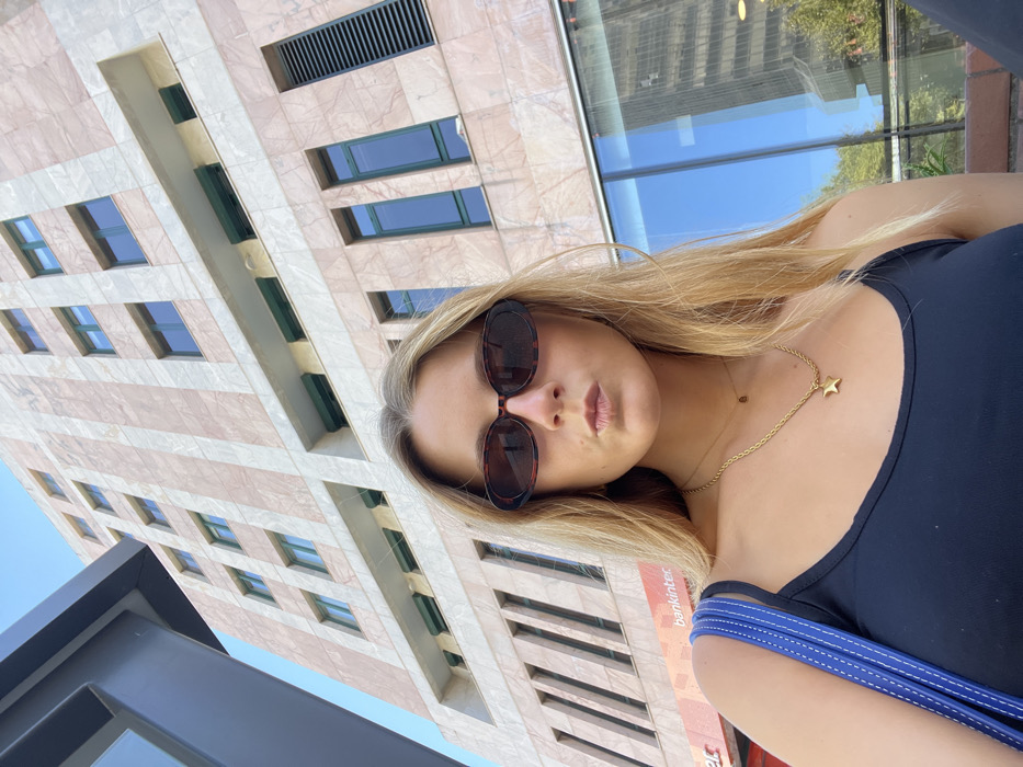 A young adult female is depicted in a close-up, selfie-style photograph, facing the camera with a pursed lip expression. She has long blonde hair and wears dark tortoiseshell oval sunglasses, a black tank top, and two gold necklaces, one with a star pendant and another with a small dark charm. The blue strap of a bag is visible on her left shoulder. The background features a tall, multi-story building characterized by a light pink and beige marble facade with distinct vertical striped panels. Numerous rectangular windows with dark green frames are visible, some with closed green exterior blinds. A "Bankinter" sign is partially visible on the ground level of the building. To the lower right, a reflective glass surface shows distorted reflections of adjacent urban structures. A clear blue sky is visible in the upper portion of the image. The scene is located at Avenida da República 50, Lisbon, Portugal.