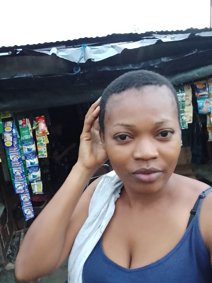 A dark-skinned female is positioned in the foreground, facing the camera directly. She has short, closely cropped black hair and is wearing a dark blue tank top with visible black bra straps. A light-colored garment is draped over her left shoulder and arm. Her right hand is raised, with fingers touching the right side of her head above the ear. The background features a modest retail stall, characteristic of a street vendor or small shop in Agani, Nigeria. The stall roof consists of corrugated metal, partially obscured by a dark tarp secured with a blue rope. Numerous pre-packaged consumer items, including multi-packs of sachets (e.g., 'MILK' products) and individual snack packages, hang from display lines within the stall's open front. The interior of the stall appears dimly lit. No other individuals or significant actions are observable.