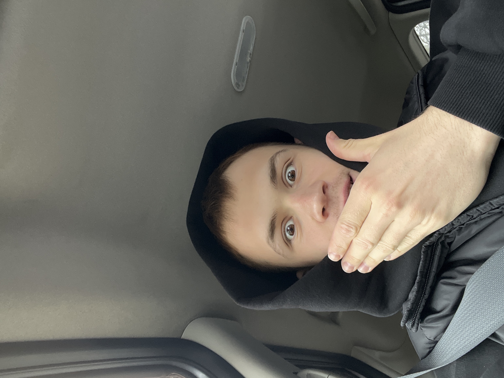 A single individual is depicted in the interior of a vehicle, positioned in the front seat. The subject, a male with short brown hair, is wearing a black hooded sweatshirt with the hood pulled over his head, and a black puffer jacket underneath. A gray seatbelt is visible across his torso. His eyes are wide open, directed towards the camera, and his right hand is held over his mouth. The vehicle's interior features a light gray headliner with a rectangular overhead light fixture, and a dark gray trim piece is visible along a window pillar on the left side of the frame. A blurry outdoor scene is partially visible through the window on the left. The scene is located in the city of Unknown, Unknown.