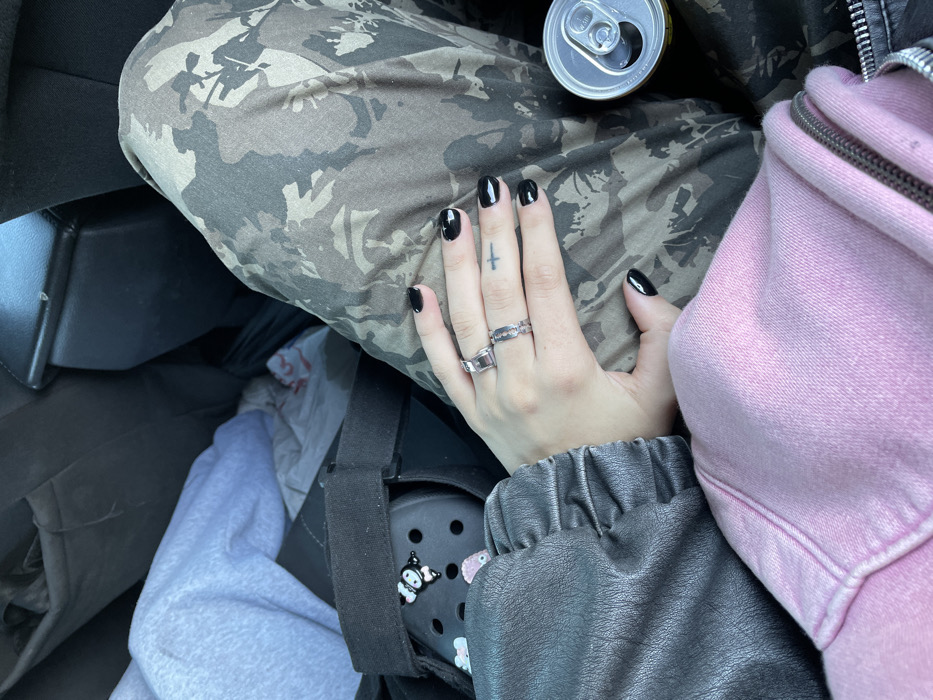 The image depicts a person's lap in a car. They wear camo pants, a grey jacket, and have black nail polish. A hand with rings rests on the pants; a small cross tattoo is visible on a finger. A pink denim jacket is partially visible. A can of beverage sits on the camo pants. The person wears a black Croc adorned with cartoon character charms. A grey sweatpant leg is visible below.