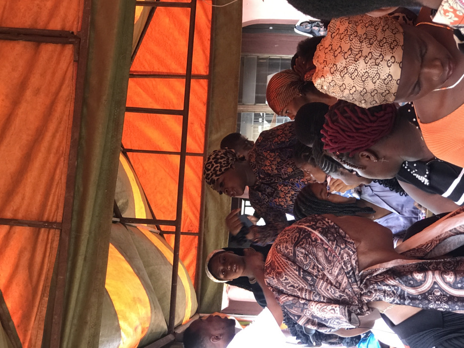 A gathering of approximately 10-15 individuals, predominantly adult females, is observed under a dual-toned canopy, orange on the top and olive-green on the underside, supported by dark metal framing