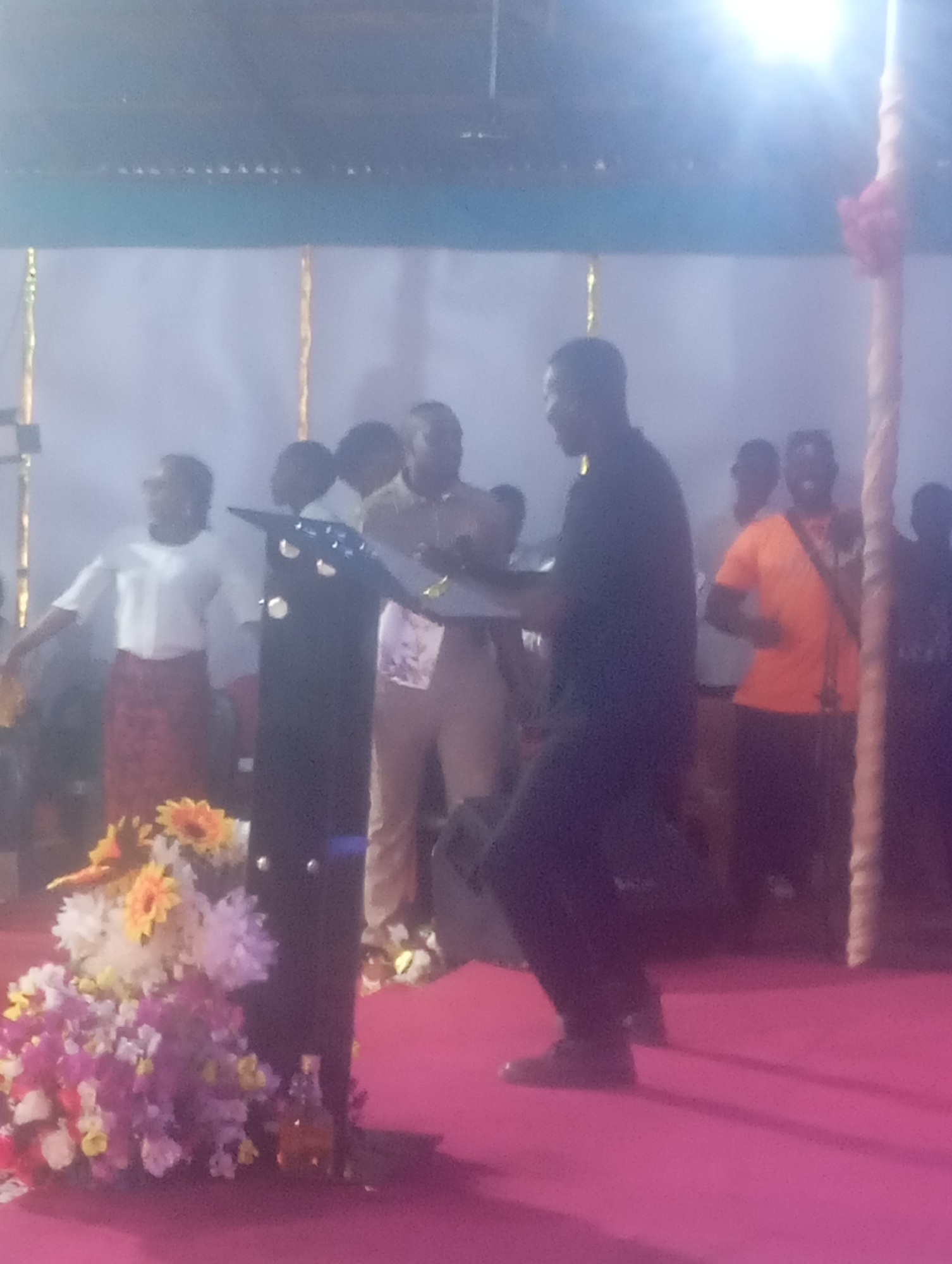A man in a black shirt and pants stands on a pink carpet on a stage in what appears to be a church setting. There are several other people behind him, some in casual attire, and a woman in a white shirt and patterned skirt. A black podium with decorative buttons is positioned in front of the man, adorned with an arrangement of colorful flowers at its base. The background is a white curtain, and there are decorated poles on either side of the stage. A blue ceiling is visible above, and the overall lighting suggests an indoor setting with artificial lighting. The location is identified as Makurdi, Nigeria.