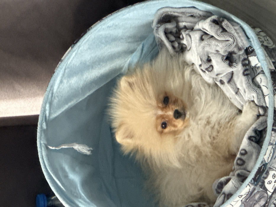 - "A single, cream-colored Pomeranian dog with dark eyes and faint reddish-brown markings around its muzzle and eyes is positioned centrally within a light blue, dome-shaped pet bed" by FM-zRS0I2, licensed under CC BY 4.0