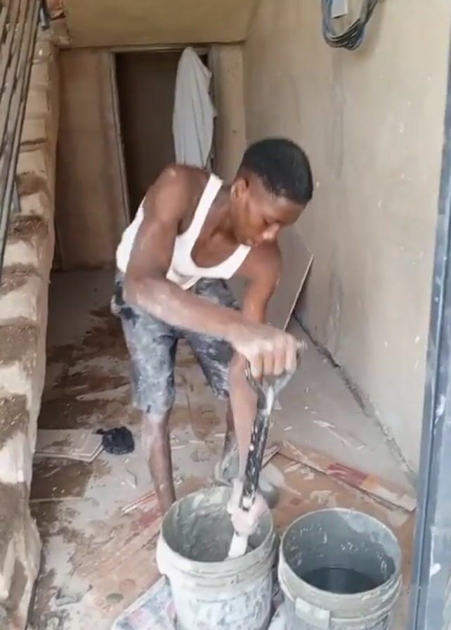 A young man wearing a white tank top and patterned shorts is seen mixing a substance in a bucket with a spade. He's standing in a narrow, unfinished room with concrete walls. There's a staircase to the left and a doorway straight ahead. Two buckets are on the floor, one with a grey mixture and the other with water. The floor is messy with tile shards and dirt. The man pauses, looks directly at the camera, then returns to mixing. Wires hang from the ceiling.