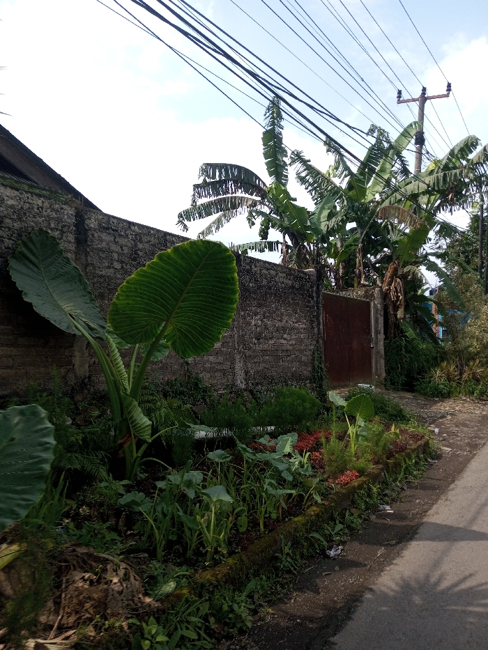 A sunlit scene features lush vegetation along a street. Large, broadleaf plants dominate the foreground, bordering a raised garden bed with various leafy greens and red flowers. A weathered brick wall with a dark metal gate forms a backdrop, partially obscured by banana trees. Overhead, a network of electrical wires stretches across a slightly overcast sky, anchored by a utility pole in the distance. The road's edge is visible on the right, casting a shadow.