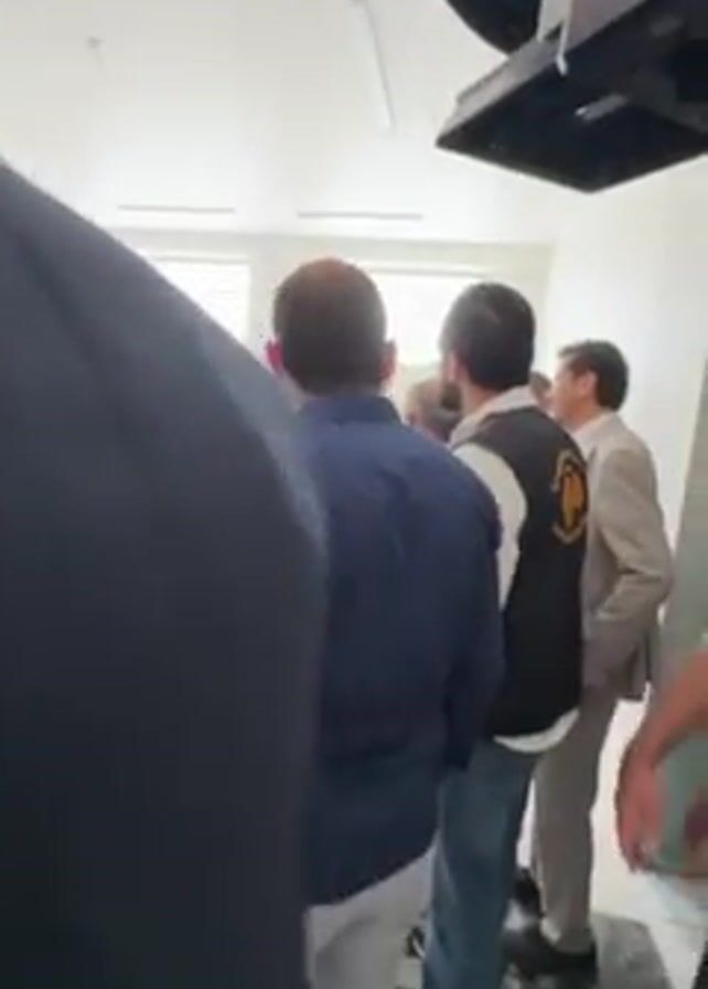 A group of men stand in a bright room, seemingly listening to someone speak, though the speaker is obscured by the crowd. The individuals are dressed in a mix of formal and casual attire, including suits, shirts, and vests. The room is sparsely furnished, with a light ceiling and white walls. A large camera with a black lens is mounted overhead, suggesting the scene is being filmed.