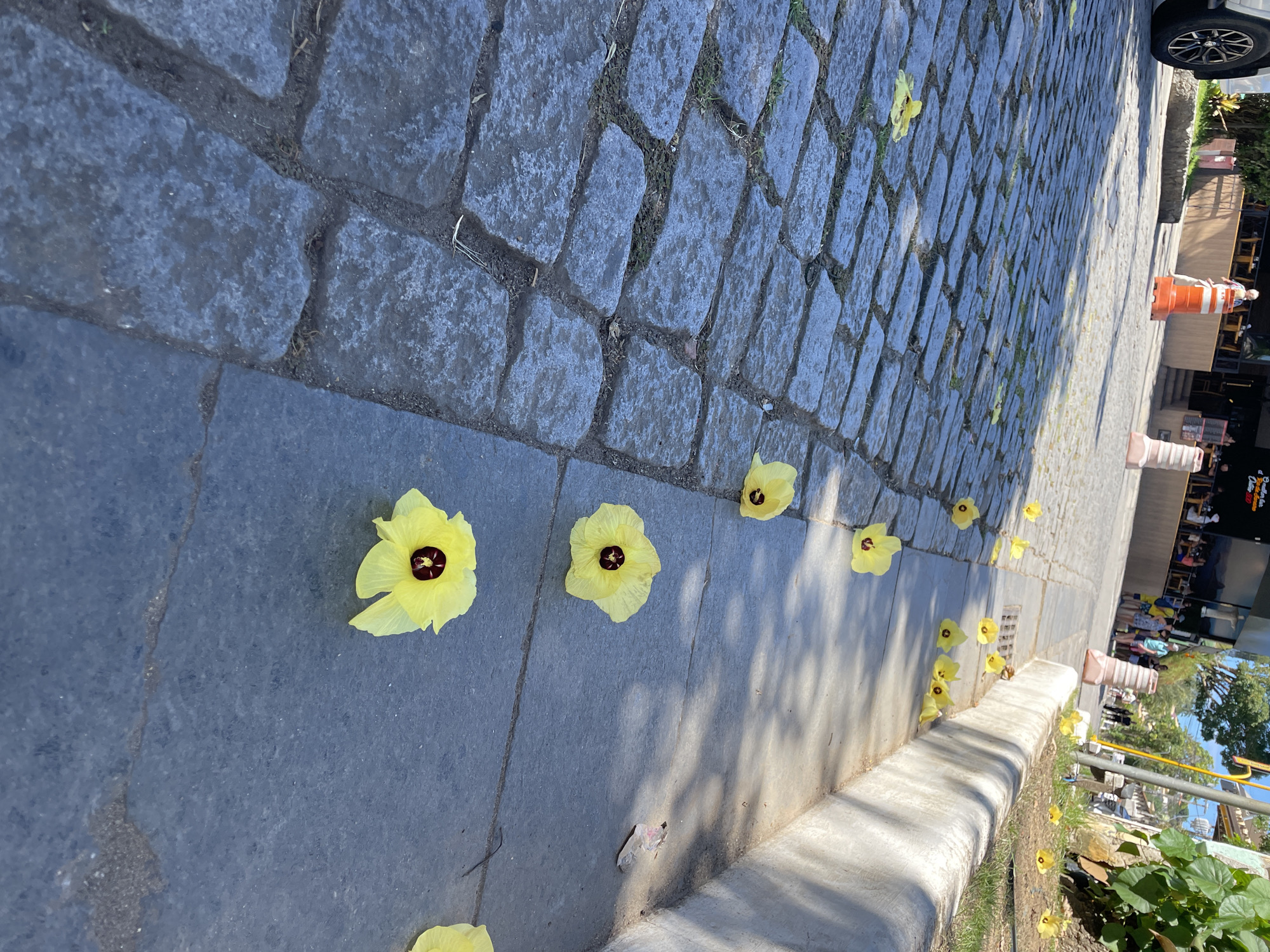 sidewalk and street in Armação Dos Búzios, Brazil, paved with cobblestones and stone slabs. Yellow flowers are scattered on the ground, both on the cobblestones and the sidewalk. The edge of a car tire is visible in the upper right corner. In the background, there is a building with outdoor seating, suggesting a restaurant or cafe. People are visible at the tables. Orange traffic cones are set up near the outdoor seating area. The image is taken from a low angle, looking along the sidewalk and street.