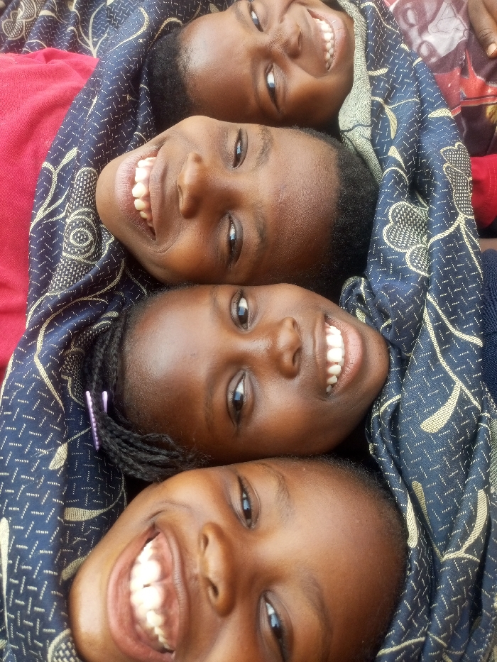 Four young girls are huddled close, their faces beaming with smiles. They are wrapped in a dark blue patterned cloth, partially revealing a red garment underneath. The girls have dark skin, and their teeth are prominently displayed in their wide grins. Their eyes sparkle with joy and warmth. One girl has braids adorned with purple clips. The close-up shot captures the intimate connection and shared happiness among the girls.