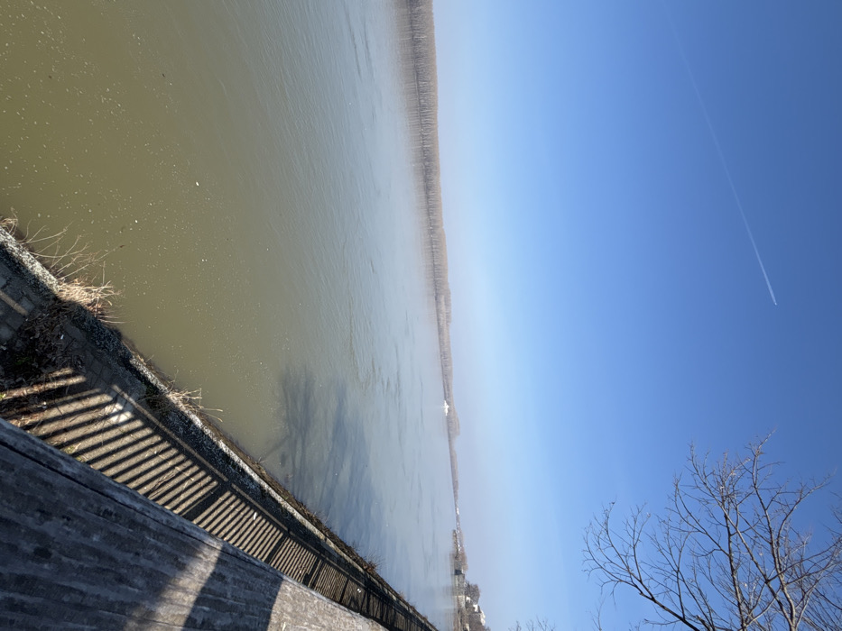 The image displays a wide, elevated view of the Danube River in Silistra, Bulgaria, taken from a riverfront promenade or the Danube Garden. The scene is observed on a clear day under a bright blue sky, with a single white aircraft contrail diagonally traversing the upper left quadrant. The river occupies the majority of the midground, its calm surface appearing murky green-brown. A dense line of bare deciduous trees, lacking foliage, forms the far bank, extending across the horizon. On the immediate right, a wooden railing is visible in the foreground, casting distinct, elongated vertical shadows onto a paved section of the embankment and the shallow river water below. Sparse, dry vegetation is present along the embankment's edge. In the mid-distance on the river, a small, light-colored vessel is discernible against the water. No individuals, actions, or interactions are visible.