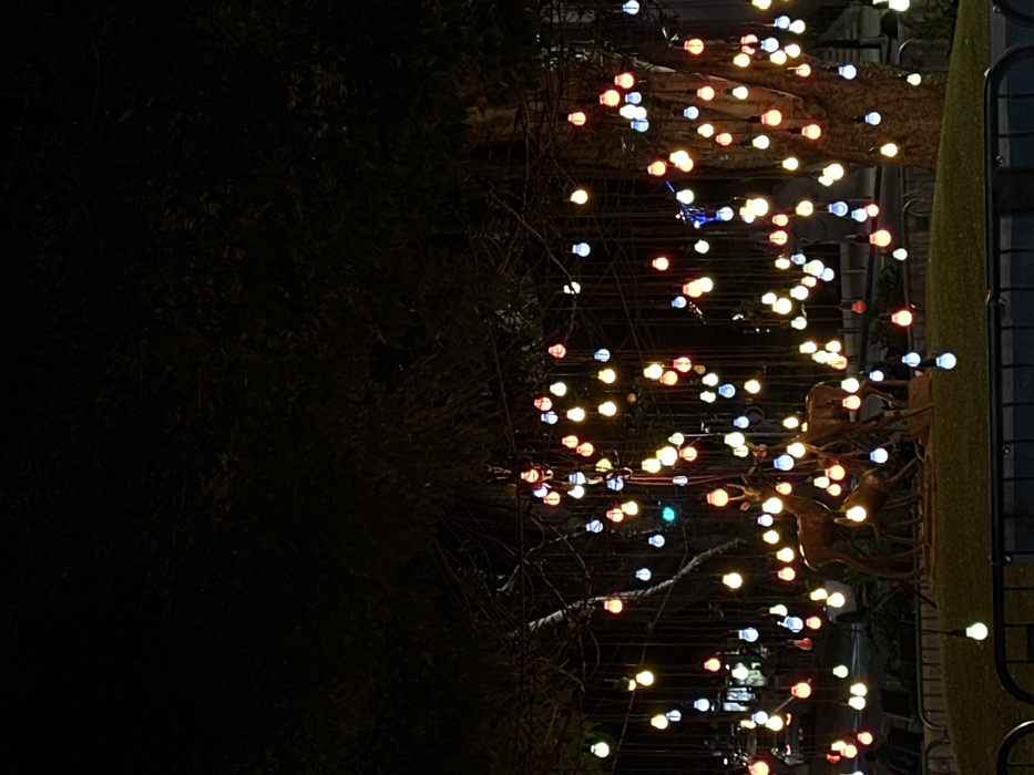 The image displays a nighttime scene in Ramat Gan, Israel, featuring the "Deer Fountain" sculpture, commonly located at the intersection of Jabotinsky and Hertzel streets. A bronze sculpture of three deer, two adults and one fawn, is positioned on a low, grassy mound in the mid-ground. Above and around the sculpture, numerous multi-colored string lights are suspended, creating a curtain-like effect. The individual light bulbs, emitting red, orange, yellow, blue, white, and green illumination, hang from dark wires and tree branches. Dark tree foliage occupies the upper portion of the frame. A dark, low-lying metal fence or barrier is visible in the immediate foreground. In the distant background, blurred urban lights suggest a street or traffic area. No individuals are visible.