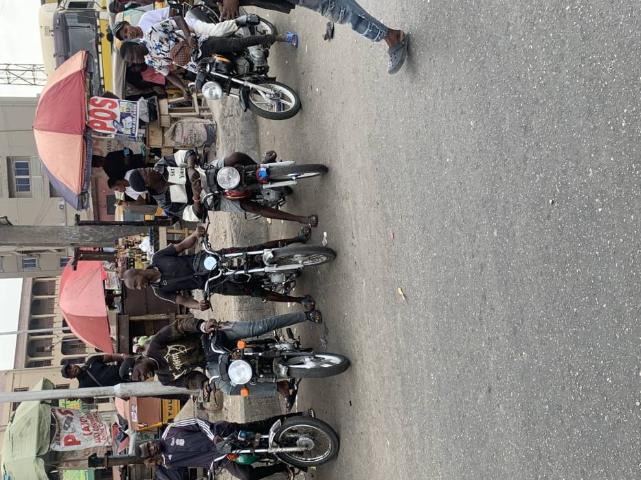 The image depicts a bustling street scene, likely a market area or transportation hub, in a densely populated urban sector of Lagos, Nigeria. In the foreground, an asphalt road occupies the lower portion of the frame. Four men are seated on motorcycles, facing generally forward, appearing to be stationary or waiting. From left to right: 1. A man with short dark hair, wearing a black and white Adidas track jacket with red stripes, dark pants, and sandals, sits on a green and silver motorcycle. He looks towards his left. 2. A man wearing a black cap, a dark long-sleeved shirt with a light graphic design, ripped blue jeans, and sandals, is mounted on a silver and black motorcycle. He looks forward with his mouth slightly open. 3. A bald man, wearing a black t-shirt, dark shorts, black sandals, and a black cross-body bag, sits on a silver and red motorcycle. He is looking towards the man to his left. 4. A man wearing a black and white striped polo shirt, dark shorts, and black sandals, is on a red and blue motorcycle. He looks forward. To the far right, a fifth man is partially visible, walking right-to-left across the frame. He wears blue jeans and a single dark grey Croc-style sandal on his visible right foot. Behind the motorcycles, a raised concrete curb separates the road from a row of makeshift commercial stalls. Two prominent market umbrellas are visible. A red and blue striped umbrella shades a stall with a "POS" (Point of Sale) sign indicating mobile money services, alongside other items, including what appear to be sacks of "SUGAR" and bottled beverages. Another person stands under this umbrella, partially obscured. A second red umbrella is visible further left, shading another vendor setup. In the mid-ground, a man in a black polo shirt and black cap stands behind a stall, looking towards the viewer. Buildings with multiple stories and visible balconies, typical of urban Nigerian architecture, form the background. A yellow commercial bus, characteristic of Lagos "Danfo" vehicles, is partially visible in the upper right background, suggesting a street with vehicular traffic. The overall environment is one of active commerce and transit.