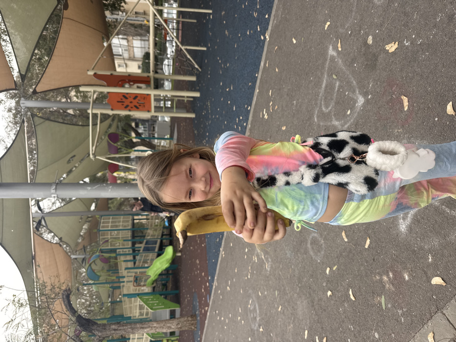 The image depicts a young female child standing on dark asphalt ground in a playground within Bat Yam, Israel. The child, approximately 5-8 years old, is positioned centrally in the foreground, facing directly towards the camera with a slight smile. She has light brown hair and is wearing a long-sleeved tie-dye crop top and matching pants in pastel shades of pink, yellow, blue, and green. A small black-and-white cow-print faux fur shoulder bag hangs across her torso, with a white faux fur handcuff-shaped keychain and a small white pendant attached. Both of her hands are extended forward, holding a ripe yellow banana, which she points towards the camera. The banana has a prominent brown blemish. In the middle ground, behind the child, is a public playground area. Visible play structures include a multi-level climbing frame with green slides, blue platforms, and orange elements. The ground beneath the play structures is covered in a blue rubberized safety surface, which transitions to dark asphalt in the foreground. Several large, beige fabric shade canopies are supported by tall gray metal poles over the playground. An adult female, dressed in dark clothing, is visible in the left middle ground near the play equipment. The ground in the foreground has scattered light-colored leaves and faint white chalk markings. In the far background, behind the playground structures, residential buildings with multiple windows are visible, and vehicles can be seen on a street or parking area. The sky appears overcast.