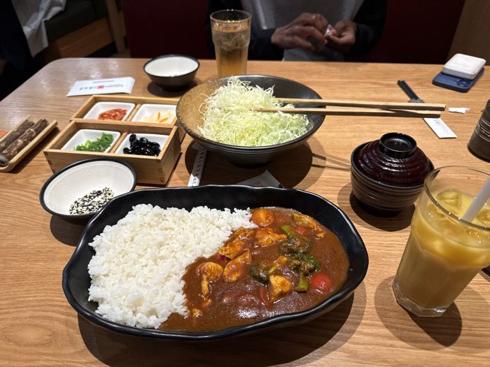 An indoor restaurant table in Dongcheng District, China, is depicted with a meal for at least one person. The light wooden table surface is predominantly occupied by various dishes and beverages. In the foreground, a black, rectangular ceramic bowl contains white rice occupying the left half and a dark reddish-brown curry with chicken pieces, broccoli florets, and red bell pepper pieces on the right half. To its right, a tall clear glass holds an orange-yellow liquid with ice cubes and a white straw. Behind these, a small, dark reddish-brown lidded bowl is positioned. To its left, a small black bowl with a white interior contains black and white sesame seeds. Further left, a rectangular wooden tray holds four small, square white ceramic dishes: one with red kimchi, one with yellow pickled daikon, one with green blanched vegetables, and one with black beans. A large black ceramic bowl filled with finely shredded light green cabbage is situated in the upper-middle, with a pair of light wooden chopsticks resting across its rim. In the blurred background, a person's hands and forearms are visible, appearing to manipulate a small white object. A tall clear glass containing a light amber liquid with ice is also present in the background. Other table items include a white folded paper napkin or condiment packet with red text and a small blue object with a white cap. A wooden rectangular tray holding three dark brown cylindrical objects is partially visible on the far left. The background suggests a restaurant setting with blurred dark red walls and wooden elements.