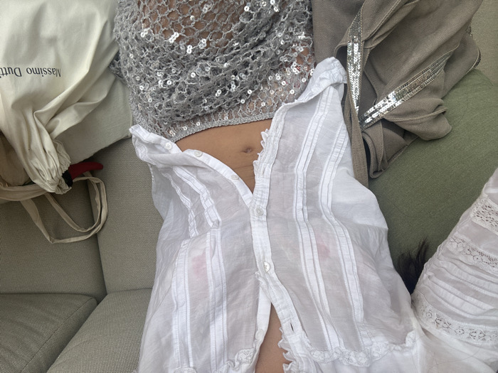 The image displays an overhead view of a person, likely female, reclining on a light grey upholstered sofa. The individual is wearing a sheer white long-sleeved button-up shirt featuring pintucks and lace details. The shirt is partially unbuttoned, exposing the navel, and the fabric's sheerness allows the visibility of the nipples. Below the waist, a grey/silver sequined open-knit garment, possibly a skirt or pareo, is visible, revealing skin underneath. To the person's left, an olive-green or khaki-colored item of clothing or fabric, possibly a bag, with a silver sequined strap, rests on the sofa. To the right, a light cream-colored drawstring bag, marked "Massimo Dutti," is present, with a red object partially visible near its opening. The specific location within Palma, Spain, is not discernible from the provided visual information; the scene depicts an indoor environment.
