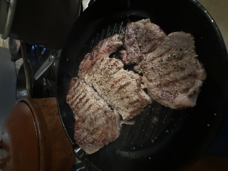 The scene depicts an indoor kitchen environment in Kfar Vitkin, Israel. In the foreground, four pieces of meat, consistent with steaks, are cooking in a black cast-iron grill pan. The meat displays visible grill marks and is seasoned with coarse black pepper. To the left of the grill pan, a large, lidded, brown earthenware pot is present. In the background, a gas stovetop is visible, with multiple dark-colored pots and pans. A distinct blue flame from a gas burner is active beneath a tall, dark pot on the right side of the background. No individuals are present in the image.