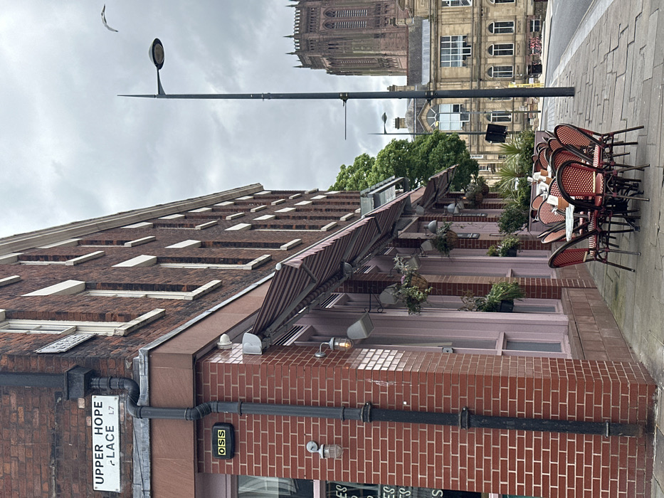 The image depicts a street scene in Liverpool, UK, located at latitude 53.401 and longitude -2.971. The scene features a red brick building with a sign that reads "Upper Hope Place L7". The building has a pink facade and awning. There are potted plants hanging from the building. In front of the building, there is a set of outdoor tables and chairs, empty and unused. In the background, a streetlamp stands tall and a large building with a tower is visible in the distance, likely the Liverpool Metropolitan Cathedral. The sidewalk is paved with gray stone. The sky is overcast and grey.