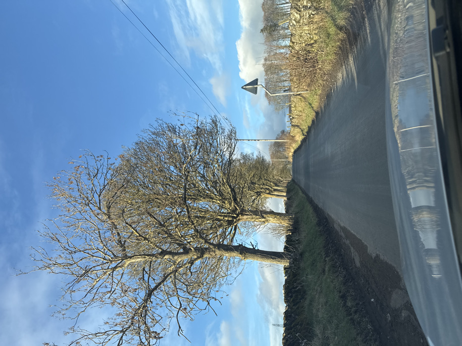 The image displays a narrow, wet asphalt road in Fowlis Easter, United Kingdom, under a bright blue sky with scattered white clouds. The perspective is from inside a vehicle, with reflections of the scene visible on the dashboard/hood in the foreground. A dry stone wall borders the left side of the road, behind which a line of bare deciduous trees, characteristic of late autumn or winter, extends into the distance. A large utility pylon is faintly visible in the far left background. The right side of the road is also bordered by a dry stone wall and sparse, dry vegetation. A wooden utility pole supports overhead power lines that run diagonally across the upper right. A black triangular road sign with a white border is mounted on a metal post on the right verge. No individuals are present.