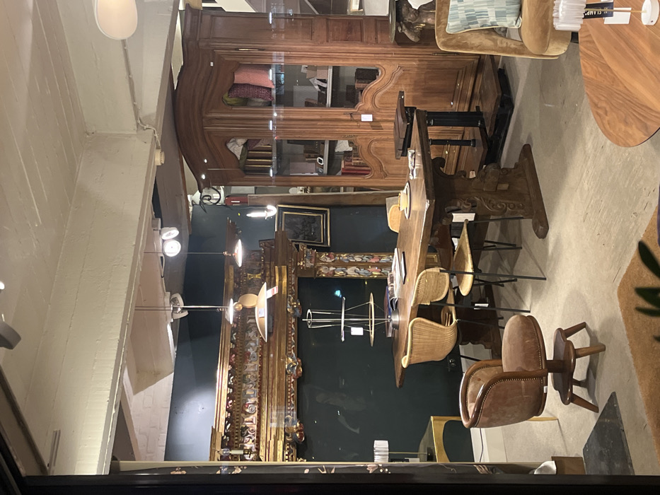 An interior showcasing antique furniture. A large wooden cabinet with glass doors stands prominently. A long, ornately carved wooden table is surrounded by woven chairs. A brown leather armchair with a unique wooden base is also visible. A decorative gilded frame and an interesting light fixture add to the ambiance. The space features a mix of dark and light colors, creating a visually rich environment.