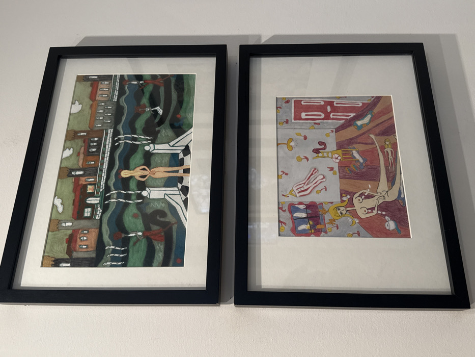 Two framed artworks are displayed vertically on a textured white wall. Both frames are black with white matting. The top artwork depicts a highly stylized cityscape strongly reminiscent of Venice, Italy. The scene features a row of buildings with red roofs and towers along a green-brown horizon. Below, a body of water with undulating green and blue patterns contains scattered, abstract red and white figures, some appearing to be in small boats. Centrally, a nude, light-skinned figure is seen from behind, standing on a white platform with a black-and-white checkerboard pattern. The bottom artwork portrays a stylized indoor scene. A nude, light-skinned female figure lies supine on a striped red and brown rug, with her left arm raised, holding a slender object. Above and behind her head, a stylized blonde-haired female bust with wide eyes is depicted. The room includes a red door on the right, a window-like feature with blue curtains on the left, and a striped fabric item hanging from the ceiling. Small yellow figures, resembling ducklings, are scattered across the floor and walls, alongside a white teapot and other abstract objects.