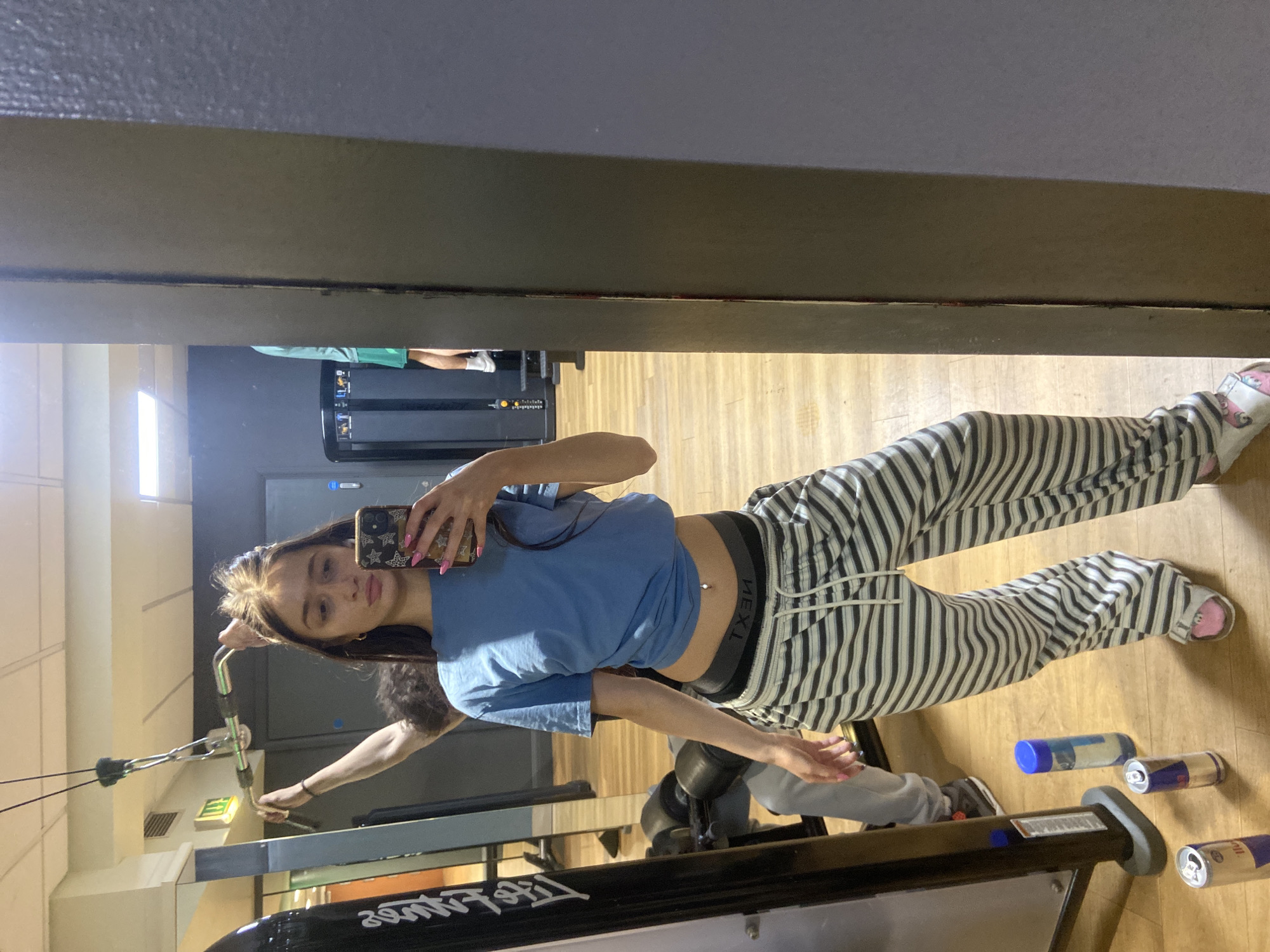 A young woman is taking a selfie in what appears to be a gym. She is wearing a blue T-shirt, striped pajama pants, and slippers. She is holding a smartphone in her right hand. Her reflection can be seen in the mirror behind her. In the background, gym equipment is visible, along with an exit sign, and multiple cans on the floor. The location is unclear. It cannot be verified if the location is in the city of London, United Kingdom.