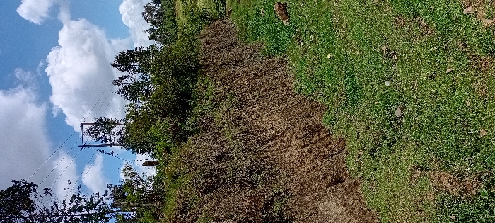 The image displays an outdoor scene in Kinale ward, Kenya, under a blue sky with scattered white cumulus clouds. The foreground features a gently sloped expanse of green grass mixed with small patches of bare earth and minor organic debris. A prominent, steep earthen embankment, displaying exposed reddish-brown soil and sparse, dry, brownish vegetation, runs across the mid-ground. Above this embankment, a dense line of various green trees forms a natural boundary. Two wooden utility poles, supporting multiple strands of overhead lines, are visible in the upper mid-section, positioned among the trees. No individuals, animals, or vehicles are present within the frame.