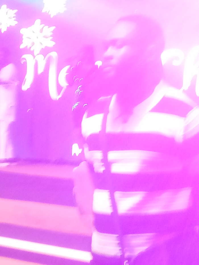 The image portrays an indoor scene in Iranla, Nigeria, engulfed in a strong magenta-purple artificial light that introduces significant blur and obscures fine details. In the right mid-ground, an individual, likely male, is partially visible, captured in motion and facing left. This person wears a horizontally striped shirt with alternating dark and light bands. Facial features and specific actions are indistinguishable due to the blur and intense lighting. The background features glowing white decorative elements: a prominent stylized script letter "M" centrally positioned, and two distinct snowflake shapes visible above and to the left of the "M." Additional blurred human figures are faintly discernible in the far left background, behind the glowing decorations. The lower portion of the image reveals a horizontal surface, possibly a stage or elevated platform.