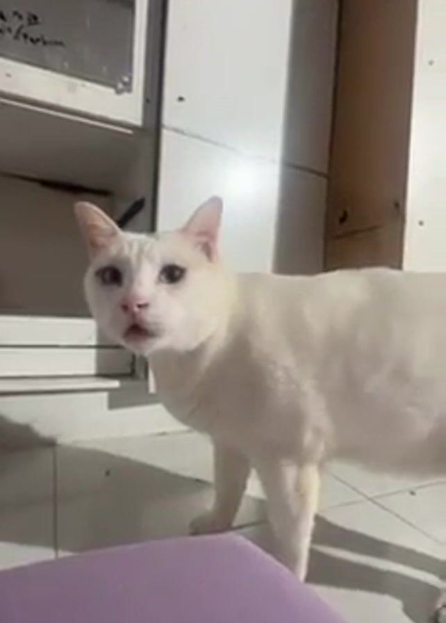 A white cat is in a room and speaks toward the camera