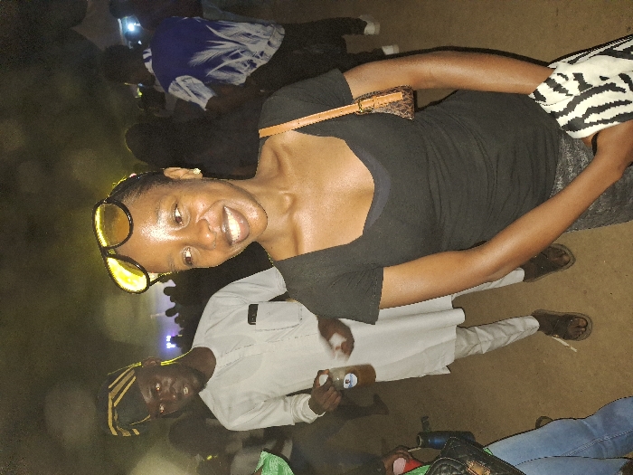 A woman with yellow-tinted sunglasses smiles at the camera, wearing a black top and carrying a zebra-patterned bag. Behind her stands a man in a traditional white outfit with a black and gold cap, holding a beverage can. Additional figures are blurred in the background. The setting appears to be an outdoor gathering with casual attire and ambient lighting.